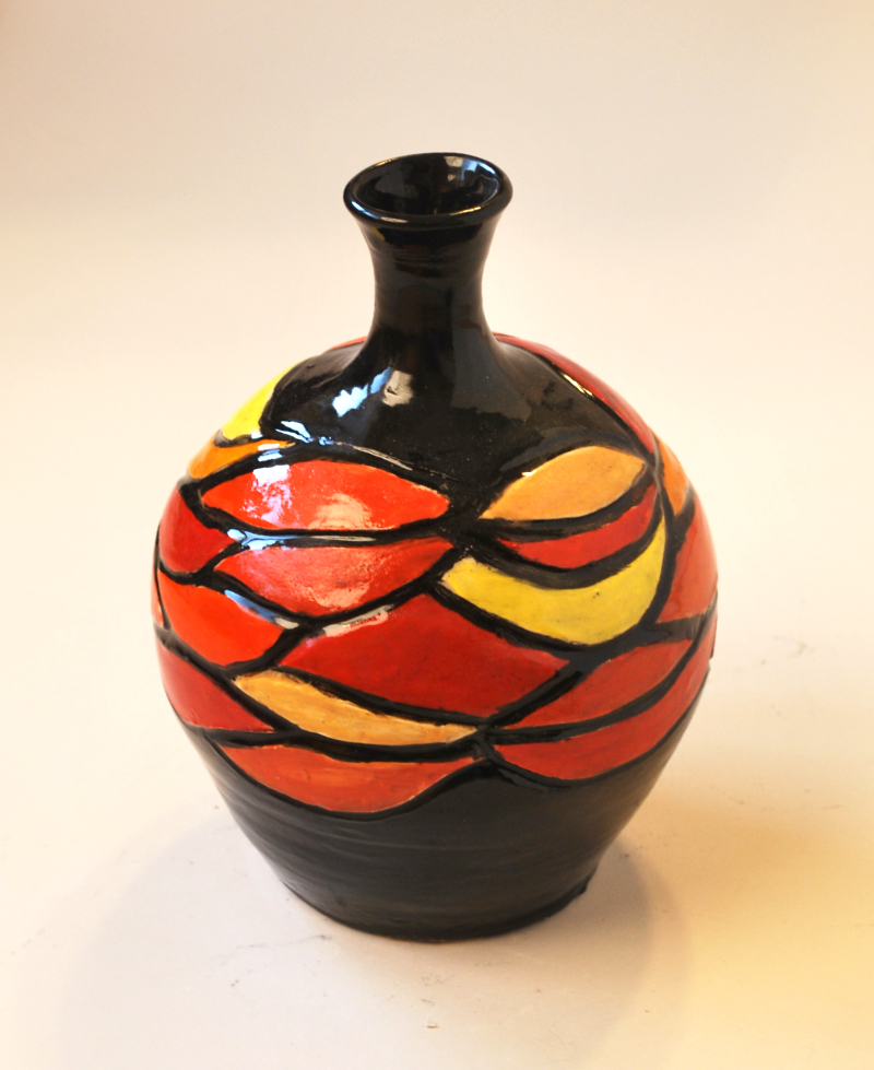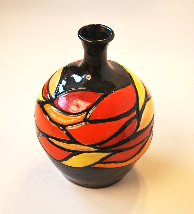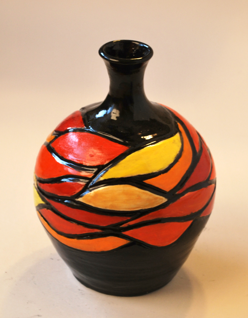 Bud Vase: Painted and Carved in Reds and Oranges with Black Background