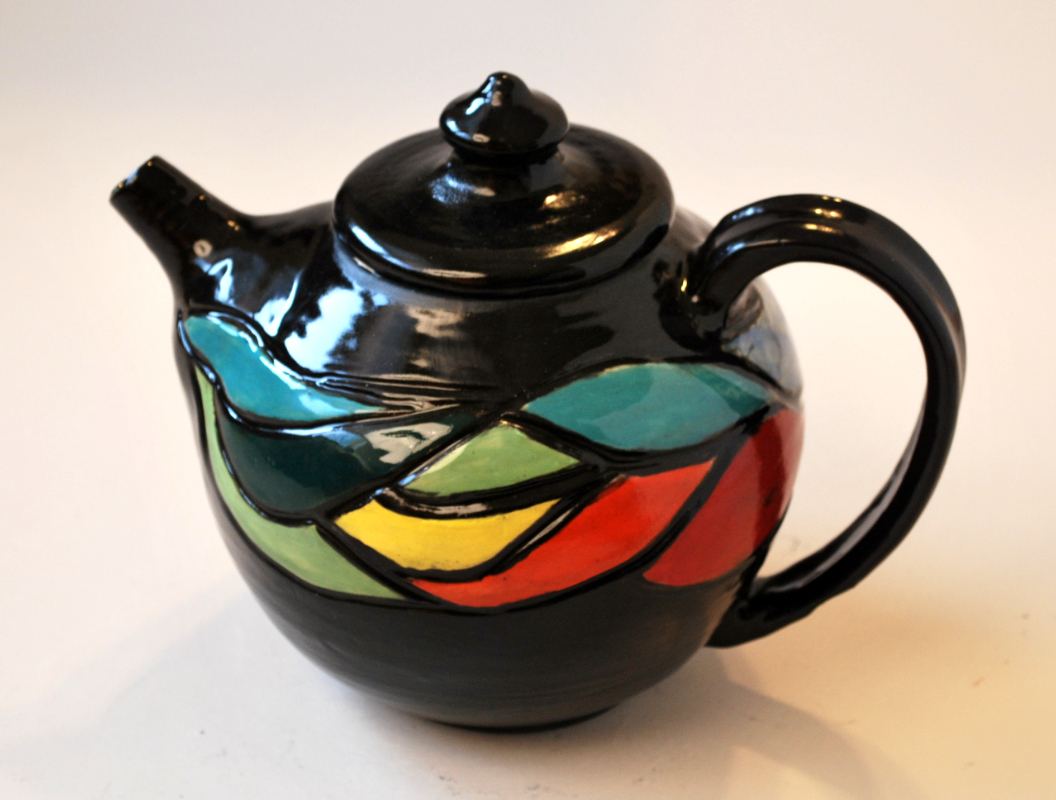 Unique and stunning teapot, hand carved and painted with underglazes.