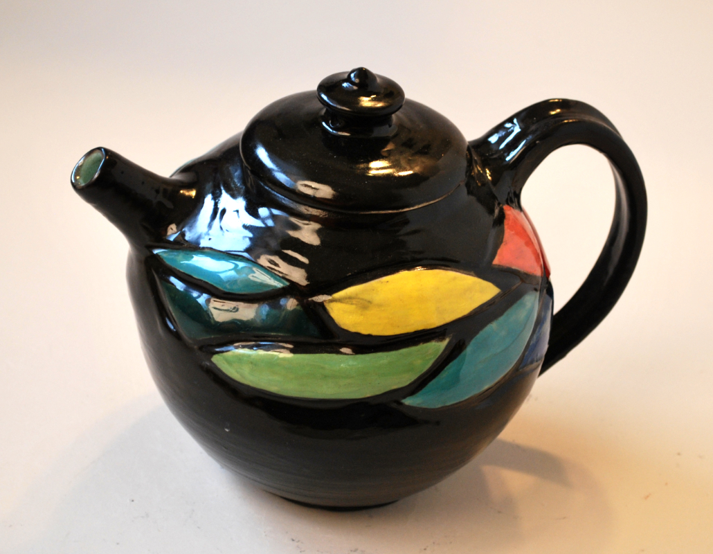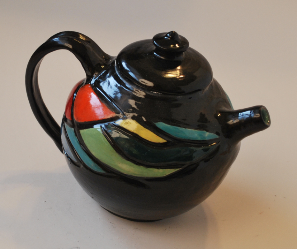 Carved and Painted Teapot with Black Background